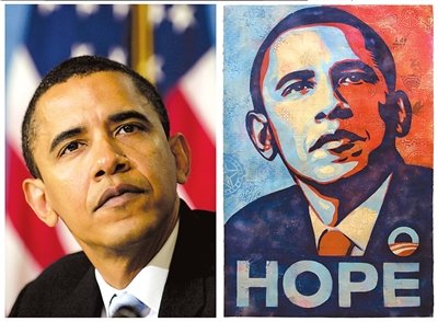 美國總統(tǒng)選舉期間,一張紅、白、藍(lán)三色相間的美國總統(tǒng)貝拉克·奧巴馬肖像廣泛傳播。圖片中,奧巴馬眼神堅(jiān)定、面部略微上仰,與圖片下方“希望”字樣呼應(yīng)。