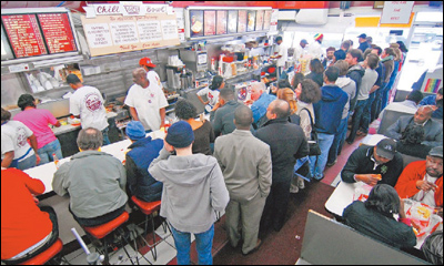 據(jù)《華盛頓時(shí)報(bào)》3月1日?qǐng)?bào)道,U街是華盛頓最大的黑人社區(qū),也是全美國歷史最悠久的非洲裔社區(qū)。自從美國總統(tǒng)奧巴馬和華盛頓市長阿德里安·芬蒂1月10日品嘗了這里“班氏餐館”的“半支香煙”(半截豬肉半截牛肉)熱狗后,這里的熱狗銷量一下子增加了兩倍,人們不得不排隊(duì)等候。