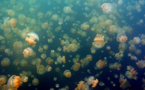 無毒水母為食草性,主要是靠海藻分泌的營養(yǎng)素維生,因此水母散發(fā)著淡淡的橘色光茫,湖中亦有大群的銀面魚及透明的月亮水母,全都是溫和無毒的。