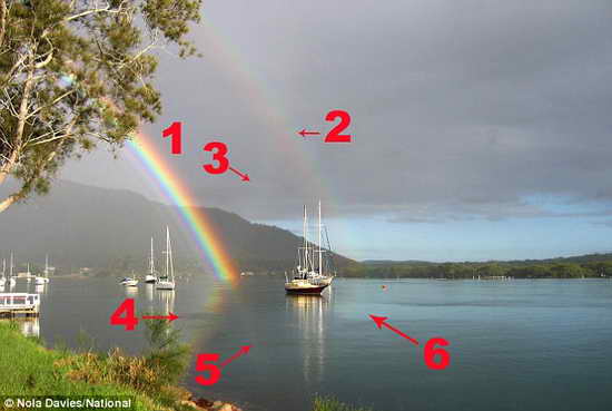 人們幾乎看不清楚第六道彩虹,但是考利博士堅持稱,如果你認真看,你就能看到第六道彩虹。他說:“諾拉的照相機只拍到了第六道彩虹(圖示6)的部分,它是河面的一次反射,雨滴內(nèi)的兩次反射形成的。由于進行了多次反射,其顏色被擴散出去,它的外貌僅依稀可見!(周翔/中國網(wǎng)3月18日訊)