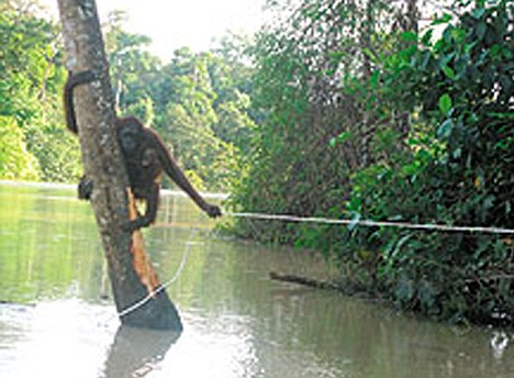 照片攝于馬來西亞的婆羅洲島。因?yàn)楹樗瑘D片中這只母猩猩和它的幼子被困在樹上幾天。世界野生動物基金會的工作人員派人給它送去繩子。