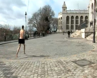 他在寒冷的氣溫中裸體握住撐竿,有節(jié)奏的助跑,還穿越塞納-馬恩省河上的藝術(shù)大橋,所經(jīng)過的地方都立刻吸引路人目光。