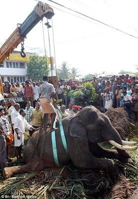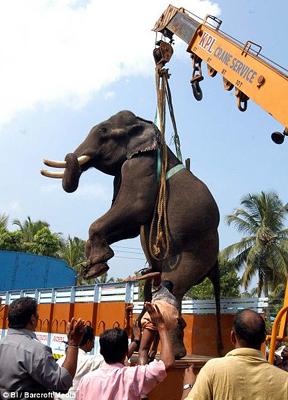據(jù)英國《每日郵報(bào)》4月1日的報(bào)道,周二,印度喀拉拉邦一頭公象在交通繁忙的公路上被一輛卡車撞到,兩條后腿骨折和背部受傷,獸醫(yī)不得不動用起重機(jī)來搬運(yùn)這個“龐然大物”。據(jù)報(bào)道,這頭大象高9英尺(約2.7米),重達(dá)6噸,剛剛從附近的一家印度教寺廟逃出。在事發(fā)現(xiàn)場,數(shù)百名觀眾正在觀看獸醫(yī)如何救治受傷的大象和如何將它搬離現(xiàn)場。一名獸醫(yī)表示,這頭大象體型龐大,情緒極不穩(wěn)定。不過,它此前一直生活在附近人來人往的寺廟,所以對人并不十分恐懼。在對大象做過全面評估后,他們決定從附近的建筑工地上征用一輛起重機(jī),將這頭大象吊到卡車上,將它運(yùn)往一家獸醫(yī)醫(yī)院。據(jù)悉,搬運(yùn)工作進(jìn)展得十分順利。不過,令人可悲的是,盡管獸醫(yī)在努力救治這頭大象,但由于它的傷勢過于嚴(yán)重,于當(dāng)天晚間死去。