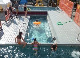 據(jù)臺灣《中國時報》報道,這座游泳池位在紐約市布魯克林區(qū)歌瓦努斯運河河畔,共有三個池子,全是由垃圾收集箱改造而成,泳池旁邊有一片平臺,放著幾張海灘椅和烤肉架,還附設(shè)一個淋浴間。從7月4日開幕以來,已經(jīng)舉辦過烤肉、電影試映和攝影等活動,許多紐約藝文界人士趨之若鶩。