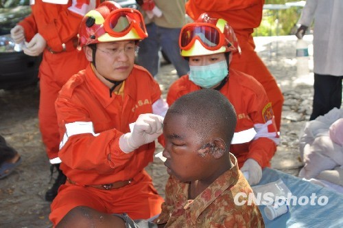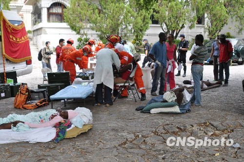 海地當(dāng)?shù)貢r(shí)間14日9時(shí),中國武警總醫(yī)院赴海地國際救援醫(yī)療分隊(duì)開設(shè)第一個(gè)流動(dòng)醫(yī)療點(diǎn),已為110名受傷的災(zāi)民提供醫(yī)療救助。海地總理禮賓官趕到醫(yī)療救助點(diǎn),他握著來自中國武警總醫(yī)院的醫(yī)生的手說:“感謝中國國際救援隊(duì),你們是第一支來總理府進(jìn)行人道主義救助的救援隊(duì)”。
