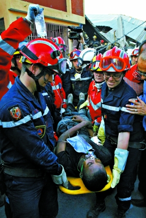 法國(guó)救援隊(duì)23日從瓦礫里救出了一名24歲的海地男子。這名男子已經(jīng)被埋了11天。救援隊(duì)員們激動(dòng)地說(shuō):“這簡(jiǎn)直就是生命奇跡!