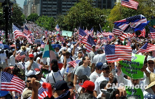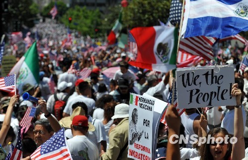 洛杉磯市墨西哥裔市長維拉萊戈薩現(xiàn)身游行現(xiàn)場,他以祖父從墨西哥移民美國的故事告訴大家追求美國夢是每位移民的權(quán)利,他旗幟鮮明地反對亞利桑那州的新移民法,并呼吁聯(lián)邦政府加快移民改革步伐。美國國會(huì)華裔眾議員趙美心向數(shù)萬民眾發(fā)表演說,“我們現(xiàn)在就要全面的移民改革!”趙美心等國會(huì)議員最近發(fā)起推動(dòng)的一項(xiàng)移民議案得到了絕大多數(shù)拉丁裔移民家庭的擁護(hù)。