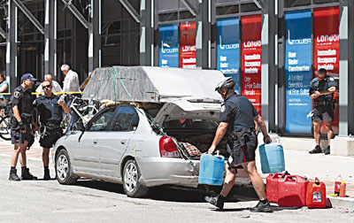 中新網(wǎng)6月26日電 據(jù)香港《文匯報》26日報道,G20峰會前夕,各成員國領(lǐng)袖陸續(xù)抵,加拿大警方在多倫多市采取極嚴密保安措施。連日來已有3名可疑人士被捕,其中1名53歲男子前日駕車經(jīng)過峰會會場禁區(qū),由于車頂綁著1個鋼制儲物箱,模樣怪異,引起警方注意。警察攔車檢查,赫然發(fā)現(xiàn)車上有十字弓、電鋸、棒球棍、大錘外,還有多種不明液體。警方?jīng)]收這批物品,并將他拘捕。
