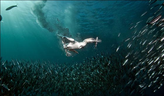 這群從南非海域向更暖和的印度洋遷徙的沙丁魚不僅要面對(duì)能以每小時(shí)40海里行進(jìn)的鯊魚和海豚的追逐,還要防止陰險(xiǎn)的塘鵝從空中的偷襲。