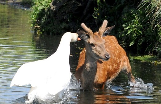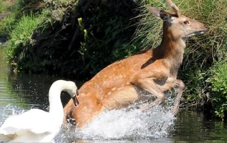 一只年幼的小鹿冒險(xiǎn)在倫敦的Richmond公園里想小浸鹿蹄,不幸地是,該地盤內(nèi)的主人天鵝卻并不想和小鹿分享這一湖水,立刻對(duì)準(zhǔn)小鹿的耳朵猛啄,用力捍衛(wèi)自己的領(lǐng)土。盡管小鹿在體形上占據(jù)優(yōu)勢(shì),但是小鹿最終還是不敵兇悍的天鵝,落慌而逃。