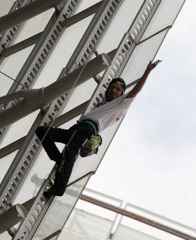 中新網(wǎng)6月2日電 據(jù)外電報(bào)道,法國“蜘蛛人”羅伯特2日再次挑戰(zhàn)極限,在毫無安全繩索保護(hù)的情況下,徒手攀上了41層共219米高的澳大利亞悉尼Aurora Place大樓。