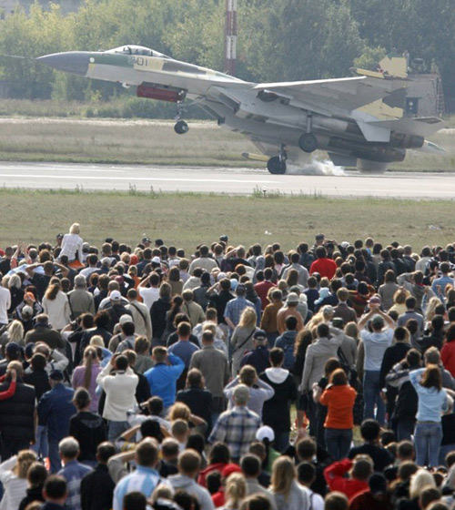 圖片是8月22日周六在航展上蘇-35飛行資料圖。有參觀者還誤以為是俄新式戰(zhàn)機(jī)在進(jìn)行特技表演。照片清楚顯示,飛機(jī)降落時(shí)發(fā)生傾斜,靠右側(cè)起落架落地。駕駛該飛機(jī)的是第一個(gè)(2008年2月)駕駛蘇-35的飛行員謝爾蓋•伯格達(dá)。(梁小逸)