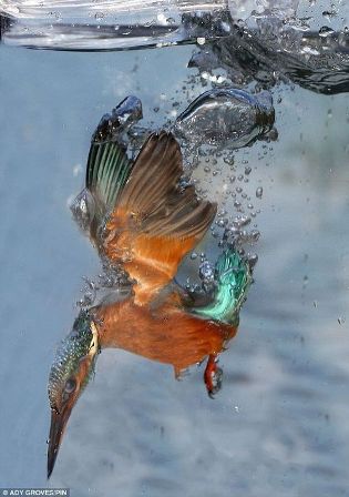 翠鳥(niǎo)的俯沖速度每小時(shí)達(dá)40公里,能捕捉到水下60厘米處的魚(yú),通常只能看到一個(gè)藍(lán)點(diǎn)一閃,它們就鉆進(jìn)了水里。由于翠鳥(niǎo)的眼睛能迅速調(diào)整水中光線所造成的視角反差,因此翠鳥(niǎo)捕魚(yú)幾乎是百發(fā)百中。