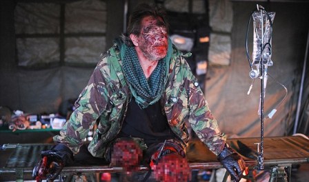 借助涂抹假血等化妝技術(shù),斯威夫特看上去就像是一名剛剛在爆炸中嚴(yán)重受傷的士兵。他雙腿齊刷刷地斷掉,斷腿裹著的繃帶滲出血跡,周圍還掛著被炸爛的肉、皮,有的地方骨頭還露了出來。