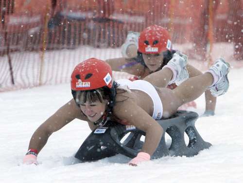 這場上空雪橇錦標(biāo)賽吸引了30名年輕男女參賽,其中不乏前凸后翹的性感辣妹與身材壯碩的猛男。