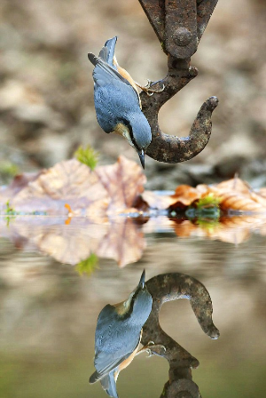 中新網(wǎng)3月23日電 據(jù)英國(guó)《每日郵報(bào)》22日?qǐng)?bào)道,一名英國(guó)攝影師在自己建造的掩體下呆了一個(gè)月,只為了拍攝雀鳥(niǎo)臨水嬉戲的照片。功夫不負(fù)有心人,他拍到了一只五子雀(Nuthatch)水中照影自憐的完美照片,十分有趣。