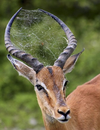 據(jù)報道,攝影師弗蘭克.所羅門(Frank Solomon)在南非游獵時,無意之中在克魯格國家公園(Kruger National Park)拍攝到了這張奇怪的照片。照片中,一只蜘蛛和它的“小窩”正結(jié)結(jié)實實地掛在一頭黑斑羚的兩只角和臉部之間,但黑斑羚似乎沒有察覺到自己的異樣,與蜘蛛十分和諧地相處。