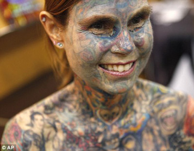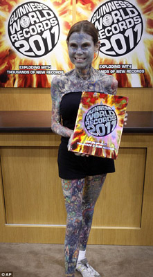 中新網(wǎng)5月27日電 據(jù)英國媒體報(bào)道,美國女孩希努斯(Julia Gnuse)全身95%都覆蓋著五顏六色的紋身。她也被吉尼斯世界紀(jì)錄評為世界上紋身最多的女人。5月26日,她出席了紐約圖書博覽會(huì),也展示了自己身上的紋身。