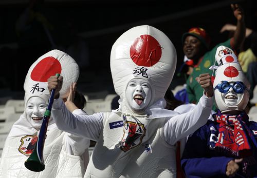 中新網(wǎng)6月22日電 據(jù)臺灣“東森新聞網(wǎng)”22日報道,南非世界杯開幕后小組賽如火如荼地進行,除了場上拼搶的各國球員,為球員們加油助威的各國女球迷無疑也成為賽場邊一道吸引人眼球的風景線。不過,除了網(wǎng)絡走紅的美女球迷,更夸張的是日本裝扮奇特的女球迷,活像一個個保齡球瓶,又像“安全套”。