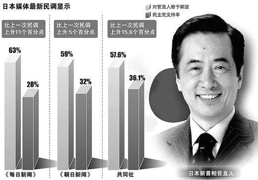 如果說去年9月民主黨實(shí)現(xiàn)政權(quán)更迭是日本政治的歷史性轉(zhuǎn)折,那么今年6月民主黨再次組閣則是擺脫該黨頹勢(shì)的重要轉(zhuǎn)折。近日,日本多個(gè)民調(diào)顯示,民主黨的支持率正迅速大幅回升。