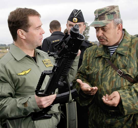 電視畫面顯示,梅德韋杰夫身著海軍夾克!睹咳针娪崍蟆穲蟮,軍服上有徽章顯示“D.A. 梅德韋杰夫,俄羅斯聯(lián)邦武裝部隊總司令”,軍服上還有一面小的俄羅斯國旗。在演習現(xiàn)場,梅德韋杰夫端起一把機槍,饒有興致地查看各種裝備,并不時同俄羅斯軍隊高官交談。