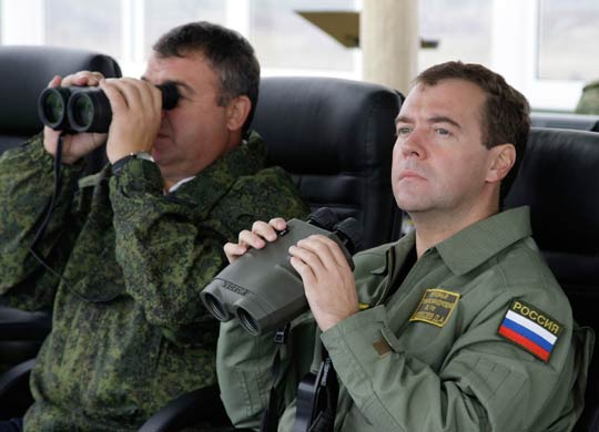 據(jù)英國《每日電訊報》28日報道,近日,俄羅斯正同白俄羅斯在加里寧格勒地區(qū)展開聯(lián)合軍事演習。俄羅斯總統(tǒng)梅德韋杰夫也身著軍裝出現(xiàn)在演習現(xiàn)場,他甚至端起一把機槍,并且用雙筒望遠鏡觀看演習情況,展現(xiàn)自己的硬漢形象。