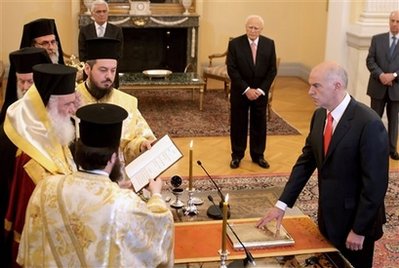 希臘當(dāng)選總理、泛希臘社會主義運動(泛希社運)主席帕潘德里歐6日在總統(tǒng)府正式宣誓就職,并公布了新內(nèi)閣成員名單。