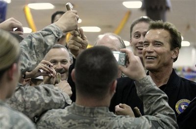 16日,美國加州州長施瓦辛格來到位于伊拉克首都巴格達(dá)郊區(qū)勝利營一個熱鬧的餐廳,與在餐廳的駐伊美軍士兵們見面。他對軍隊(duì)的工作表示祝賀,感謝士兵及其家人做出的犧牲,并與士兵握手、擺姿勢拍照。施瓦辛格還叮囑士兵們健身鍛煉的必要性,表示“每天都要(為自己)打氣”。