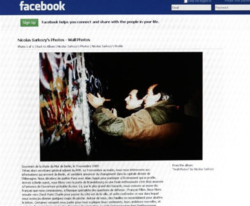 前幾天,薩科齊在社交網(wǎng)站facebook上發(fā)布了一張舊照片,顯示他正在鑿柏林墻,聲稱自己于1989年11月9日用鐵鎬見證了柏林墻的倒塌。
