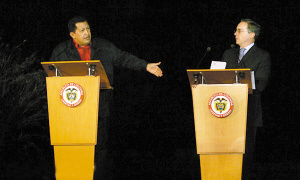 據(jù)外電報(bào)道,22日在墨西哥召開的拉美峰會(huì)上,委內(nèi)瑞拉總統(tǒng)查韋斯與哥倫比亞總統(tǒng)烏里韋互相指責(zé),甚至口出侮辱性詞語(yǔ)。查韋斯后來(lái)拂袖而去,而烏里韋不依不饒,諷刺查韋斯應(yīng)該“像個(gè)男人一樣承擔(dān)爭(zhēng)吵的后果”。