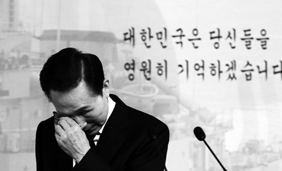 “身為總統(tǒng),我要將天安艦沉沒原因一查到底,徹底查明真相……”說到這里,身著黑色西裝的李明博聲音開始哽咽,隨后他從右邊褲兜中掏出藍(lán)色的手絹擦了擦鼻子,然后繼續(xù)語氣堅(jiān)定地說:“調(diào)查結(jié)果出來后,我們要堅(jiān)定不移地采取果斷措施。”