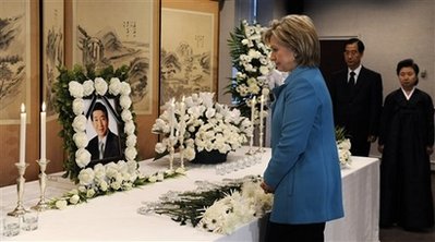 希拉里當(dāng)天上午9時(shí)抵達(dá)大使館,在韓國駐美大使韓德洙的帶領(lǐng)下走向盧武鉉的靈堂。在吊唁簿上簽字,向靈堂獻(xiàn)花,并進(jìn)行了默哀。
