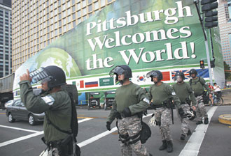 據(jù)當?shù)鼐浇榻B,為確保二十國集團金融峰會的安全,有關(guān)方面部署了將近5000人的警力,其中包括約2500名國民警衛(wèi)隊員、1200名州警、870多名匹茲堡市警員以及其他執(zhí)法人員。