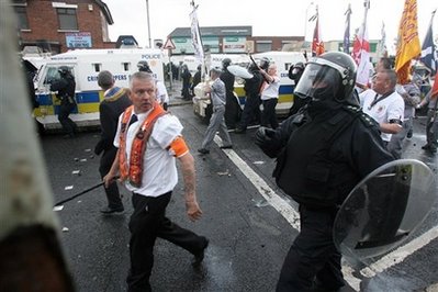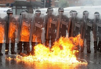 13日晚,在貝爾法斯特參加游行的新教徒向防暴警察投擲汽油彈、焰火和磚塊,警察則以高壓水槍還擊。在雙方的對(duì)峙中,警方至少開(kāi)出一槍,而有6枚燃燒彈被擲向了防暴警察。