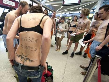 他們身著很少的衣服,一些人還在自己裸露的皮膚上寫著:誰來保護我們的隱私?他們還在微型博客網(wǎng)站Twitter上寫道:“你們無需對我們進行安檢了,因為我們已經(jīng)赤身裸體了!