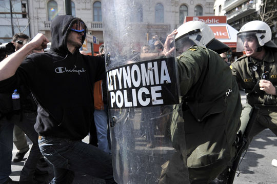 中新網2月25日電 據香港《大公報》報道,希臘警方星期三(24日)在雅典市中心向示威者發(fā)射催淚氣并與示威者發(fā)生沖突。這場釀成暴力的示威,旨在抗議政府為了挽救債務危機而采取的緊縮措施。