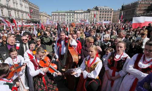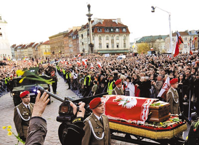 當(dāng)靈車緩慢穿過克拉科夫狹窄街道時(shí),哀悼者為卡欽斯基夫婦鼓掌、拋花和揮舞波蘭國旗?J斯基夫婦的遺體,是用飛機(jī)從華沙運(yùn)抵這里的。