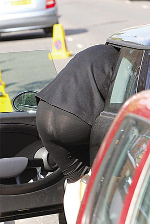狗仔近身跟拍這位新首相夫人時發(fā)現(xiàn),當天薩曼莎雖然以一身黑色套裝包裹得嚴嚴實實,但她上車時,緊身黑裙在陽光下變得非常透明,還露出里面的黑色丁字褲。目前身懷六甲的薩曼莎并不像普通孕婦那樣穿著保守的內(nèi)衣,讓英國媒體驚嘆她特立獨行的穿衣品位。