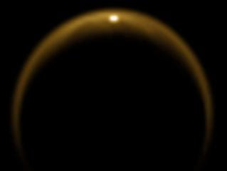 由于土衛(wèi)六上空厚厚的大氣層的干擾,土衛(wèi)六表面所反射的太陽(yáng)光大多數(shù)都被遮蔽。“卡西尼號(hào)”探測(cè)器也是在偶然間拍下了這張罕見(jiàn)的照片。照片拍攝于2009年7月8日。