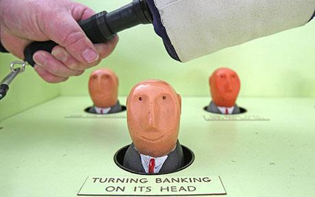 據(jù)英國(guó)《每日電訊報(bào)》12月13日?qǐng)?bào)道,經(jīng)濟(jì)衰退下,英國(guó)近日流行一種“敲銀行家”(Whack a banker)的游戲,玩家只需支付40便士(約合人民幣4.5元),就可以在銀行家彈出時(shí)重?fù)羲麄,為自己出氣?