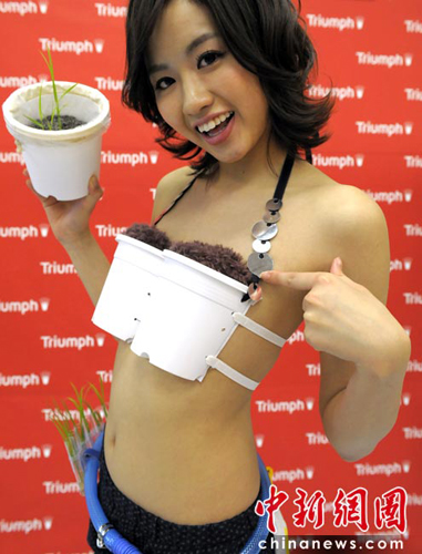 12日,日本東京,模特青山玲子正在展示日本黛安芬公司推出的一款新型內(nèi)衣。這種內(nèi)衣的罩杯是兩個(gè)“花盆”,可以種大米等農(nóng)作物。據(jù)悉,這款內(nèi)衣暫時(shí)不會(huì)在市場上發(fā)行、銷售。