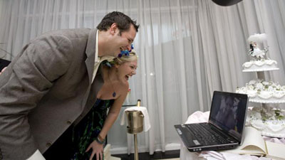 眼看婚禮要泡湯,兩人靈機一動,決定通過網(wǎng)絡向倫敦的親友們直播婚禮儀式。機場酒店人員獲悉后不但借給他們安裝了Skype聊天工具的電腦,而且還將酒店進行了一番裝飾布置,并定做了一個三層結婚蛋糕。