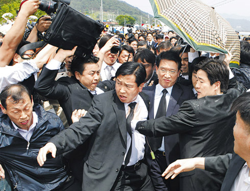 23日,和隨行人員一起乘坐大巴來(lái)到峰下村的韓國(guó)國(guó)務(wù)總理韓升洙在村子的入口處被“熱愛(ài)盧武鉉的人們的集會(huì)(盧愛(ài)會(huì))”會(huì)員和村民攔住。