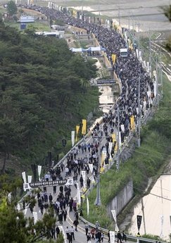 從24日上午至27日下午4時(shí),在四天時(shí)間里共有38萬多名吊客在這里就餐。主要由附近村莊的婦女會(huì)員和義勇消防隊(duì)隊(duì)員組成的300多人的志愿團(tuán)從上午11時(shí)到晚10時(shí)準(zhǔn)備出供10萬多人食用的飯(以27日為準(zhǔn)),分發(fā)給市民。晚10時(shí)以后提供面包和牛奶、碗面。據(jù)悉,在29日舉行盧武鉉遺體告別儀式后,葬禮委員會(huì)和金海市政府等將分擔(dān)食品費(fèi)用。