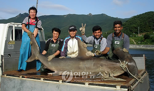 韓國(guó)國(guó)立水產(chǎn)科學(xué)院資源研究科博士金正年(音)表示:“錘頭雙髻鯊和大白鯊非常兇猛。最近在釜山共同海鮮市場(chǎng)經(jīng)常能夠見到賣鯊魚的攤位。”“隨著周邊海域海水變暖,鯊魚出沒現(xiàn)象往后還會(huì)日益頻繁!