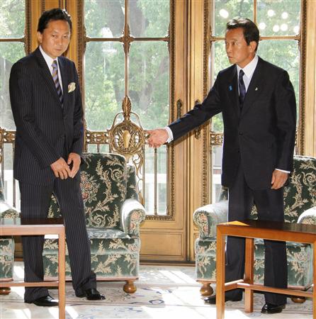 據(jù)日本《產(chǎn)經(jīng)新聞》9月14日報(bào)道,即將就任首相的民主黨代表鳩山由紀(jì)夫14日下午在國會(huì)議事堂內(nèi)與麻生太郎進(jìn)行了會(huì)談。