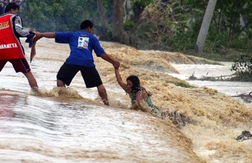 許多地區(qū)的洪水高達(dá)兩層樓高,被洪水困在屋頂?shù)木用袂疤焱砩暇烷_始紛紛打電話到無線廣播電臺(tái)求救。這簡直就是兩星期前,臺(tái)風(fēng)“凱薩娜”襲擊菲律賓時(shí),大馬尼拉區(qū)所發(fā)生的情形的再版!皠P薩娜”引發(fā)的洪水使大馬尼拉區(qū)和附近省份頓成澤國,交通癱瘓超過12小時(shí),并造成300多人喪生。