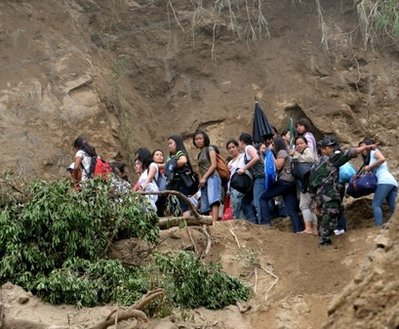 在菲律賓碧瑤市,數(shù)千名絕望的居民在山體滑坡后的懸崖邊艱難地攀爬,試圖找到出路,或?qū)で笾г。碧瑤市已和外界完全隔離長達(dá)2天,空軍只好空投食品、物資給災(zāi)民。