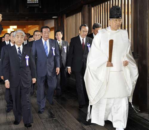 中新網(wǎng)10月21日電 最近幾天,日本政界人士紛紛前往參拜靖國(guó)神社。19日,自民黨總裁谷垣禎一進(jìn)行了參拜,并稱“不僅是二戰(zhàn),這里也祭祀著很多近代史上死去的人。是慰撫這些亡靈的心情”。20日上午,日本跨黨派議員團(tuán)體“大家一起參拜靖國(guó)神社國(guó)會(huì)議員會(huì)”的成員——包括日本眾院副議長(zhǎng)衛(wèi)藤征士郎在內(nèi)的54名眾參兩院議員參拜了靖國(guó)神社。