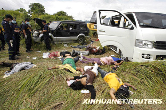 菲律賓南部棉蘭老島自治區(qū)內(nèi)的馬京達瑙省23日發(fā)生兇殘屠殺事件。一伙為數(shù)約100人的不明身份持槍者劫持了數(shù)十名當?shù)卣缛耸亢陀浾摺?/p>
